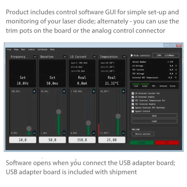 The user can set current limit and temperature limits through on-board potentiometers. Limits can also be set using your PC through the included control software. Finally, limits can be set using the analog control signals input. Setting limits are necessities to ensure a long life-time for your laser.