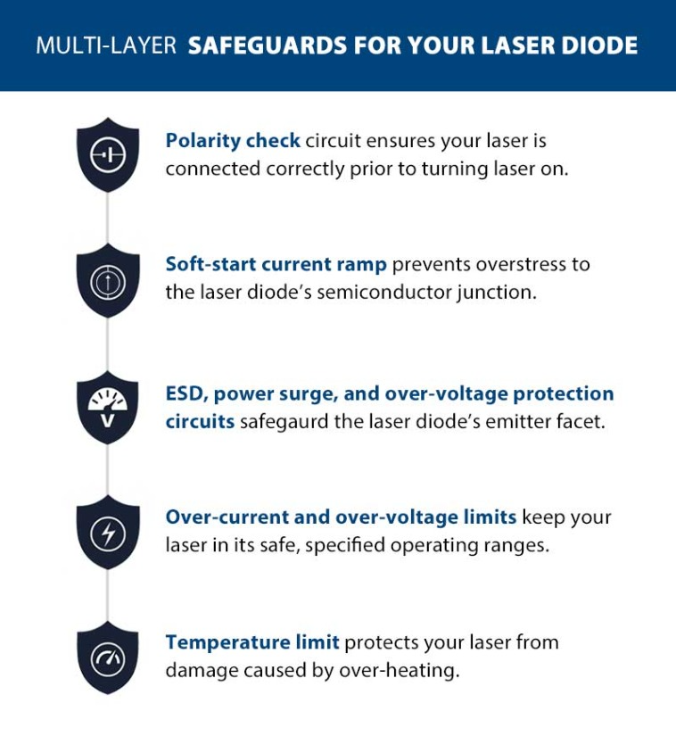 These units offer the highest level of commercially available laser diode protection to ensure that your laser is protected from damage. Current and voltage limits, upper and lower temperature limits, and a fast shut-down sequence keep your device protected at all times. The following protection features combine to safeguard your laser diode: